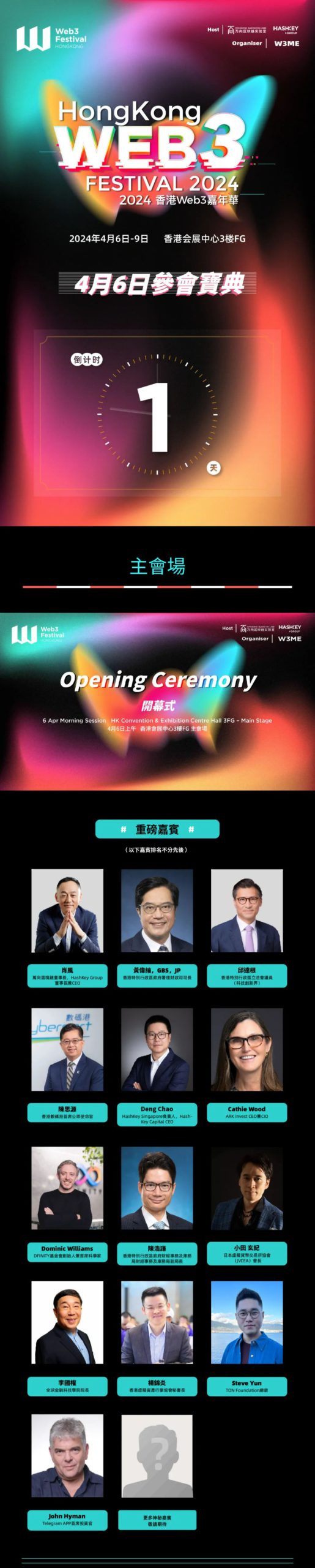 在 2024 香港 Web3 嘉年華的開幕式上,(以下嘉賓排名不分先後)萬向區塊鏈董事長、HashKey Group 董事長兼 CEO 肖風,香港特別行政區財政司副司長黃偉綸,HashKey Singapore 負責人、HashKey Capital CEO 鄧超,ARK Invest 執行長兼首席投資官 Cathie Wood,香港特別行政區立法會議員(科技創新屆)邱達根,香港數碼港管理有限公司主席陳細明,日本虛擬貨幣交易所協會(JVCEA)會長小田玄紀,全球金融科技學院院長李國權,香港虛擬資產行業協會祕書長楊錦炎,DFINITY 基金會創辦人兼首席科學家 Dominic Williams,TON 基金會主席 Steve Yun,Telegram APP 首席投資官 John Hyman 等嘉賓將深度分析 Web3 在香港乃至全球的過去與現在,並攜手開啟 Web3 的無限未來。