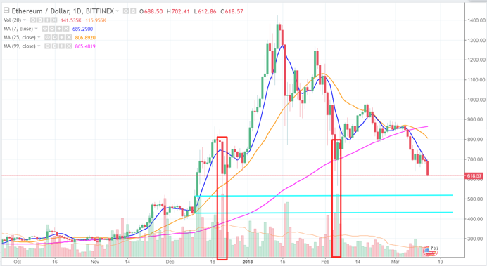 ETH跌破了前面的區間低點之後,之後將回測前波的反彈點565看是否有守。若不幸跌破了將會往前尋求去年年底的波段起漲點500以及430的支撐。