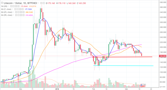 LTC目前隨著BTC的下跌已經尋求160長綠K棒的低點支撐。若BTC持續下探的話,LTC一定會伴隨著向下回測此波反彈點的130。