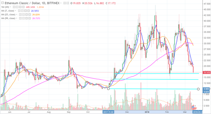 ETC表現一樣低迷,目前已經跌到了之前的起漲點17,在大環境表現不佳的情況下,ETC也將尋求下方14甚至於是10的支撐。相較於前述幣種在去年12月份的飆漲,ETC相對起來並沒有漲很多,故若以價值投資的角度的化,ETC值得緩步開始布局。
