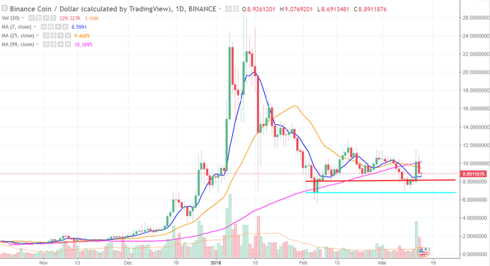 幣安宣布將拋棄ERC20進而擁有自己的Binance Chain,進而產生了在一片的悲觀行情中的亮點,最高一度漲到了接近12。幣安自己擁有了交易所,現在又要自己研發主鏈,在球員兼裁判的狀況下,走勢相較其他幣種強勢,後勢可以多加留意。目前隨著環境的不好,回跌至了9附近,短線上的支撐將會在本波段的起漲點8的位置,最後的防線為6.5。