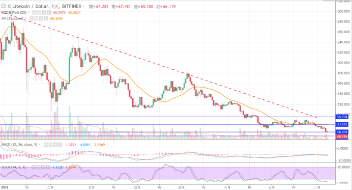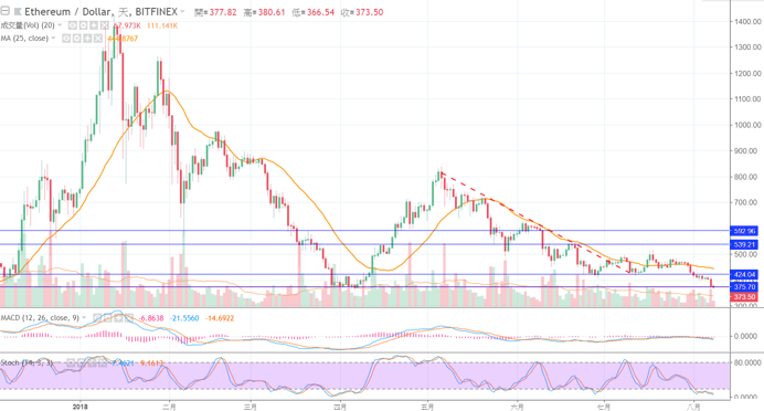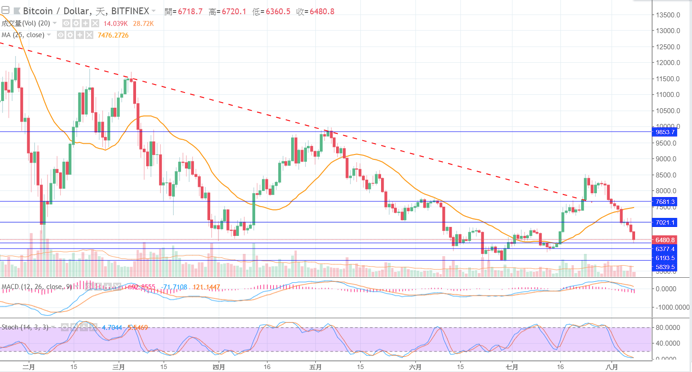 比特幣在7/31日的長紅跌破之後,歷經了一個禮拜的持續下跌,且跌破了所有均線支撐,將需要更長時間的整理,目前支撐為7/16的波段起漲點6400。
