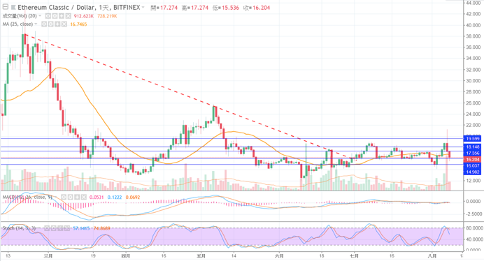 ETC在Coinbase上線利多加持之下,為本周唯一突破之幣種。但8/7日已經出現爆量以及留下長上影線的出貨跡象,從7月初開始喊進之利多已經實現,短線中建議避開此檔標的。MACD持續於0軸進行震盪,KD則已經出現了高檔死亡交叉的走勢,都讓後續走勢蒙上陰影。