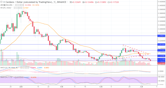 ADA已經回測至本波低點,需要更長的時間來進行整理,且MACD已經跌落至0軸下方,空方已經掌握了發語權,KD亦進入了低檔鈍化階段,需先觀察是否站上7日線。