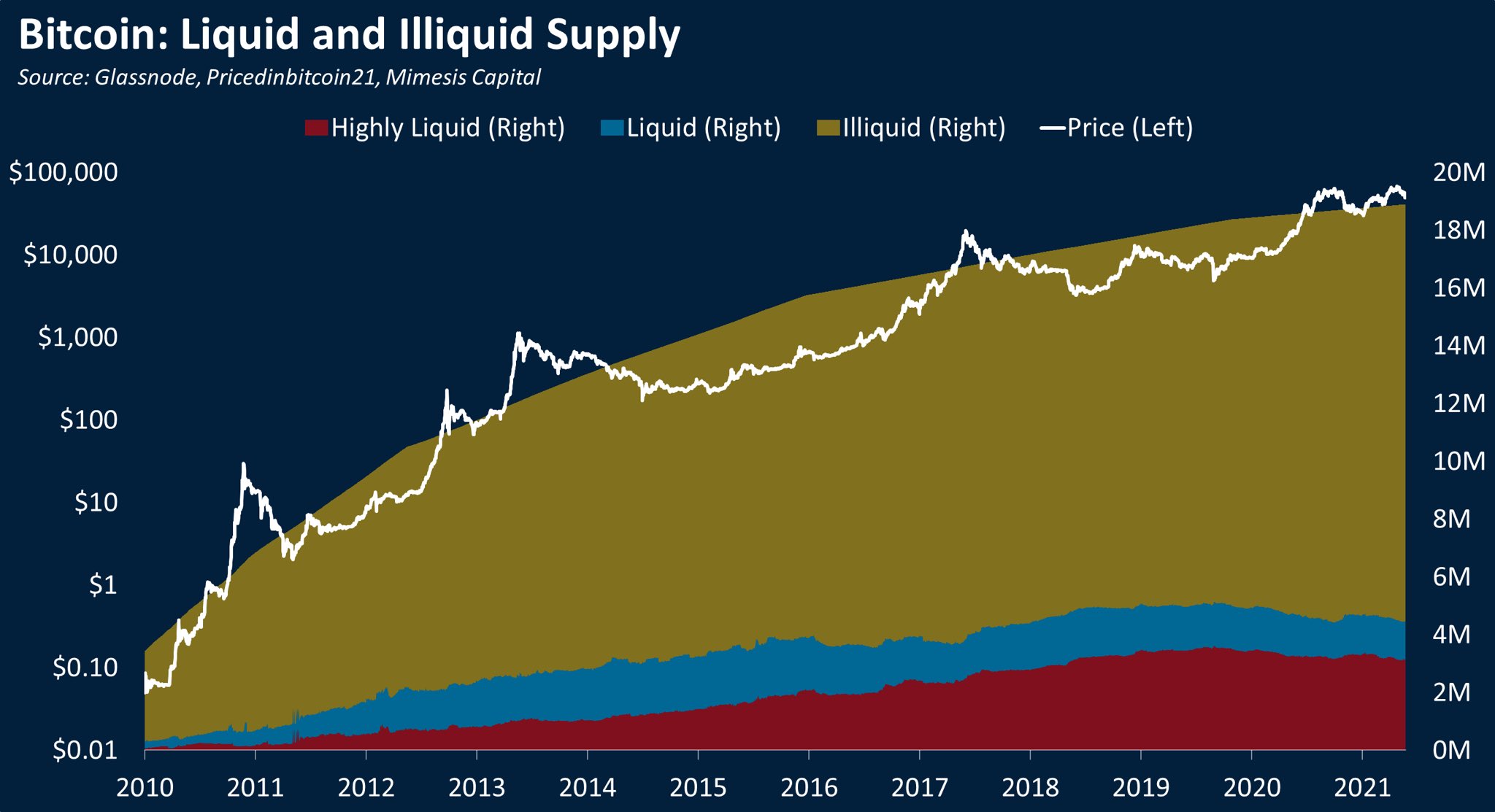 早在去年 12 月,鏈上數據分析公司 Glassnode 就曾發布報告對比特幣供應量的流動性做出分析,將持有比特幣的實體分為「高流動性」、「具流動性」、「缺乏流動性」等三種類別,而該公司研究發現,總共有 1,450 萬顆比特幣(佔比特幣流通量 78%)被缺乏流動性實體所持有。