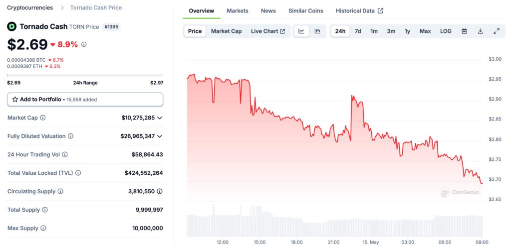 據 CoinGecko 數據顯示,撰稿當下 Tornado Cash 的原生代幣 TORN 報 2.69 美元,近 24 小時下跌了 8.9%,市值也下滑到 1,027 萬美元,遠不如許多市場上的迷因幣。
