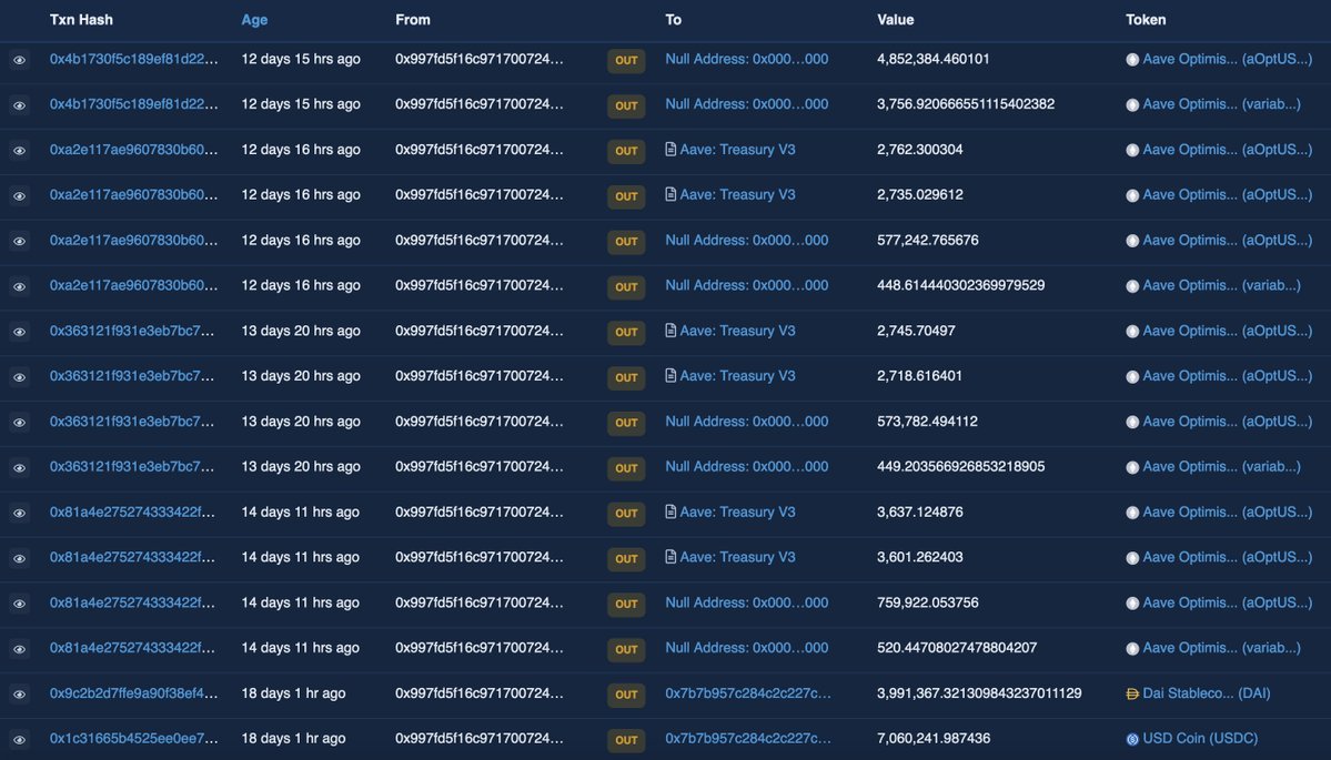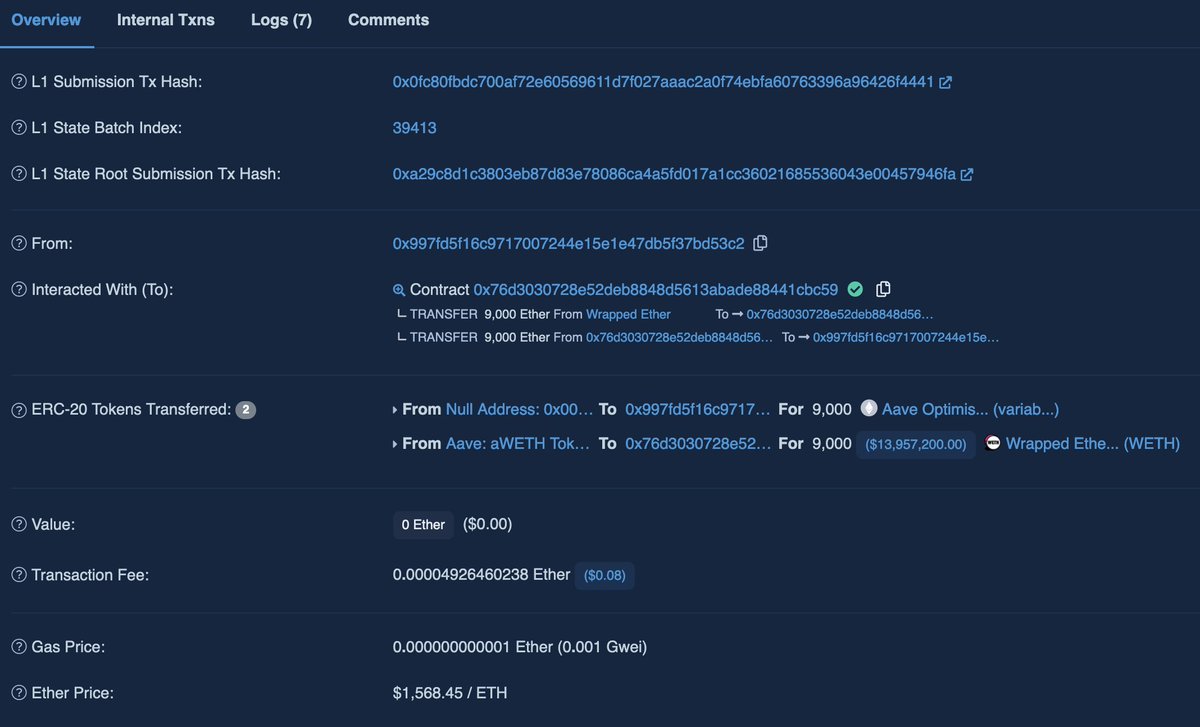 Arkham 指出,清算人接管 Alameda 開頭為 0x997 的錢包地址,最初在 Optimism 網路上持有 9,000 枚 ETH(約 1,080 萬美元) 的借款倉位(從 Aave 借出),以及 2000 萬枚 USDC 和 400 萬枚 DAI 的抵押品(存在 Aave 中)。總體來說,該帳戶當時淨餘額約為 1,520 萬美元。