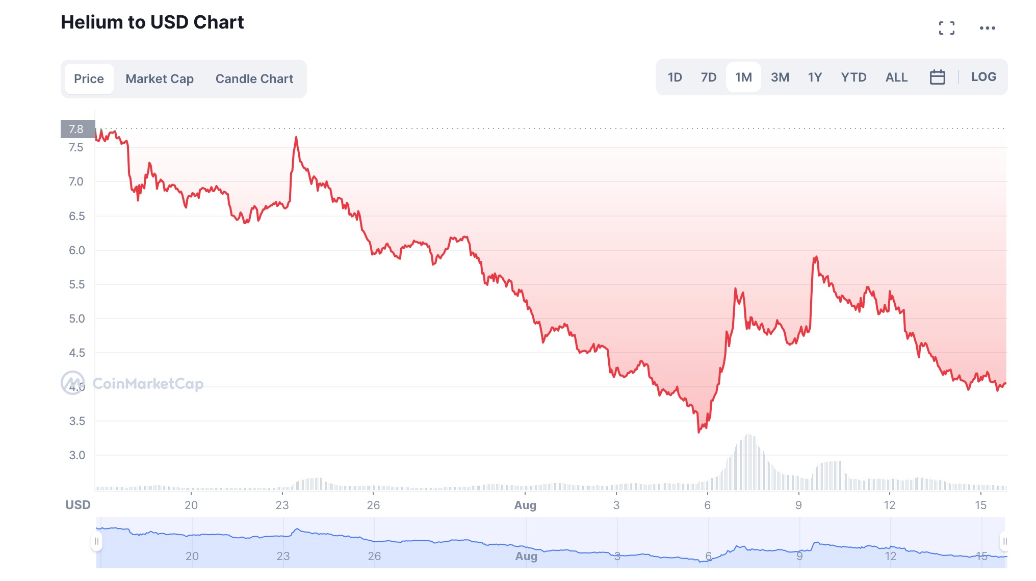 註、Helium Network 上有兩種代幣,HNT 原生代幣是 Helium 支付給熱點主機的獎勵,而 MOBILE 代幣則是支付給 Helium 5G 熱點基礎設施運營商的獎勵,MOBILE 代幣在上月剛推出,目前缺乏流動性市場,因此沒有任何報價。