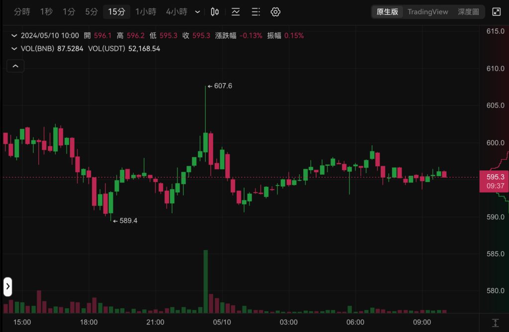 就在昨晚幣安 Notcoin 新幣挖礦公告釋出後,BNB 價格也一度上漲觸及 607 美元,不過或由於距離挖礦開始還有 3 天時間,且 OKX 此次也宣佈可用 TON 挖取 NOT,因此 BNB 很快又向下跌落,撰稿時報 595 美元,近 24 小時漲幅為 1.07%。