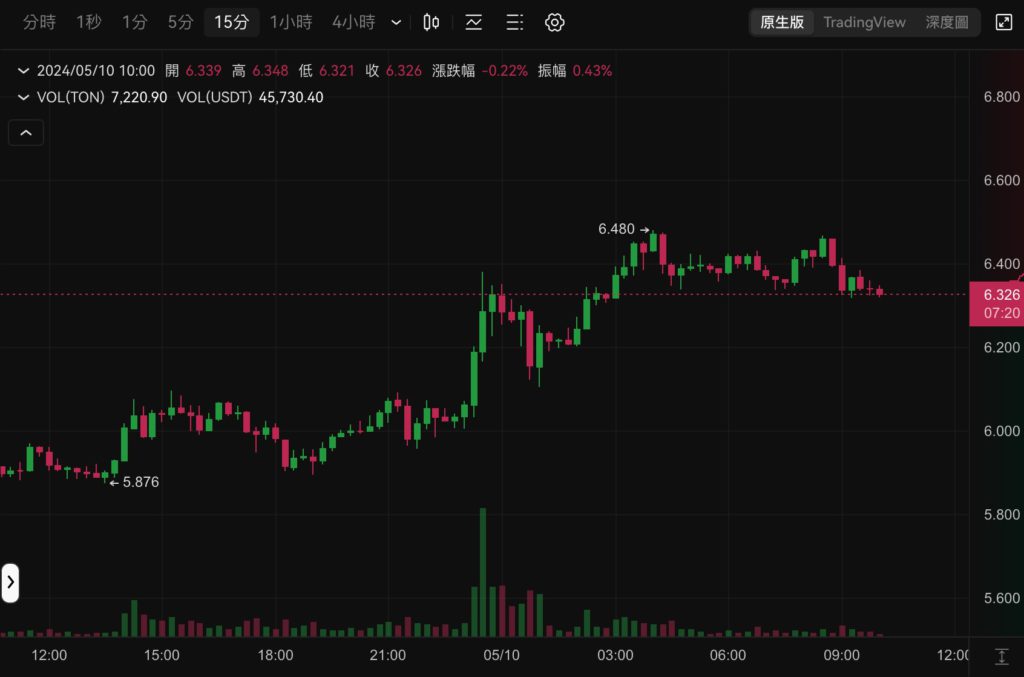 TON 幣價則是從昨晚開啟波強勁上漲,一度拉高 10% 最高觸及 6.48 美元,撰稿時報 6.32 美元,近 24 小時上漲了 6.83%。