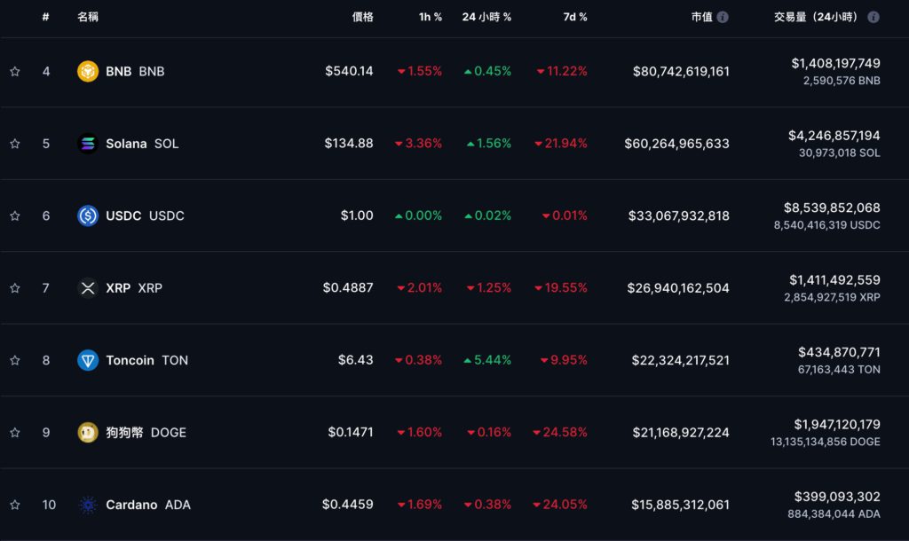 CoinMarkeCap 數據顯示,其他前十大代幣近 24 小時漲跌不一。跌幅最大的是 TON 上漲了 5.44 %、其次是 SOL 上漲 1.56%,站回 130 美元之上;跌幅最大的是 XRP,下挫 1.25%。