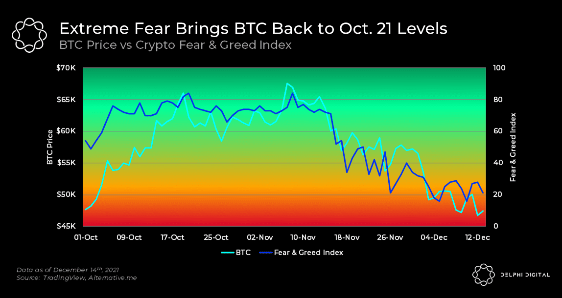 加密貨幣研究機構 Delphi Digital 在最新發布的一份報告則分享圖表指出,比特幣走勢與加密貨幣市場恐懼與貪婪指數呈現的市場情緒走勢高度吻合,而這種趨勢往往需要一段時間才能扭轉。