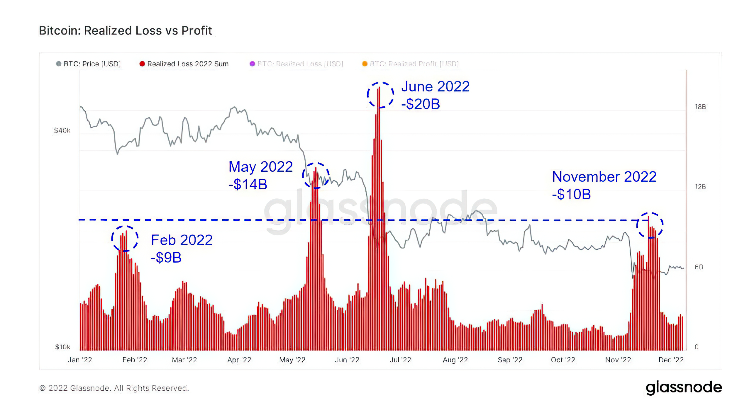 據Glassnode 數據顯示,比特幣在 2022 年的已實現損失已達到 1950 億美元,這意味著有一些持有者以低於買入價的價位,出售了他們原先所持有的比特幣,而這些損失大部分發生在今年 2 月、 5 月、 6 月和 11 月。