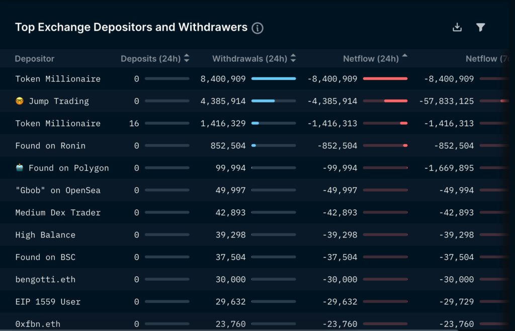 據 Nansen 進一步說明,被標記為 Jump Trading 的活躍交易地址在過去 7 天內,從交易所撤回了 5,780 萬美元的淨撤回,目前該地址仍然持有 1,880 萬美元 BUSD。