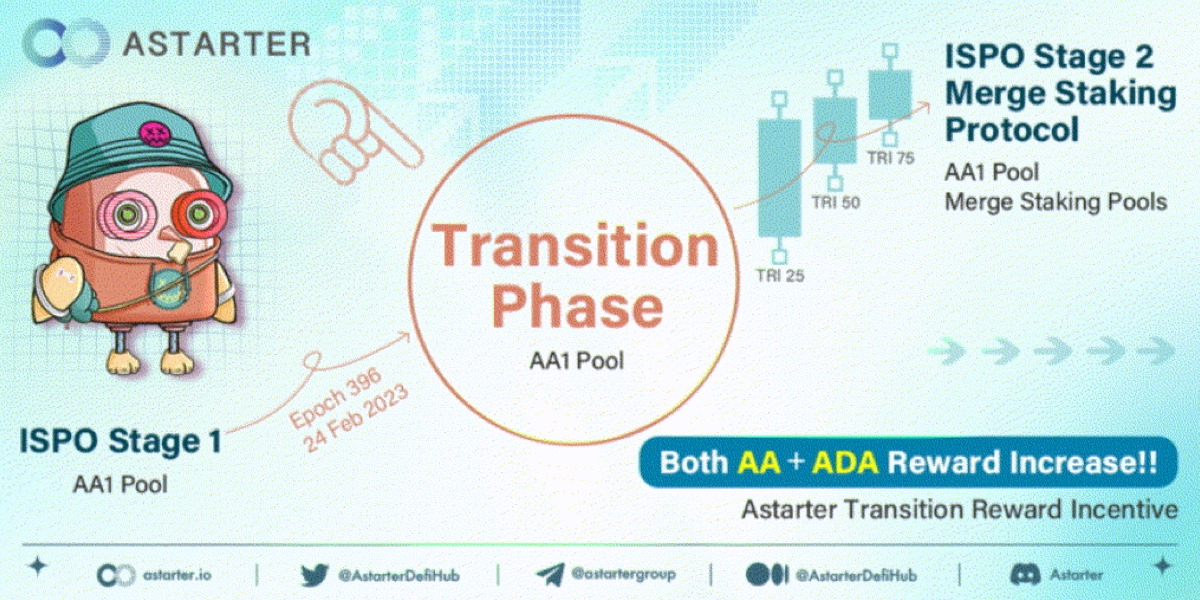 3 月 1 日(397 紀元), Astarter 的 ISPO 已從第一階段 ISPO 進入過渡階段(Transition Phase),用戶現在可在 AA1 權益池質押以獲得更多的 AA 和 ADA 獎勵,並為第二階段 ISPO 做準備。了解過渡期獎勵(Transition Reward Incentive,TRI)的細節: