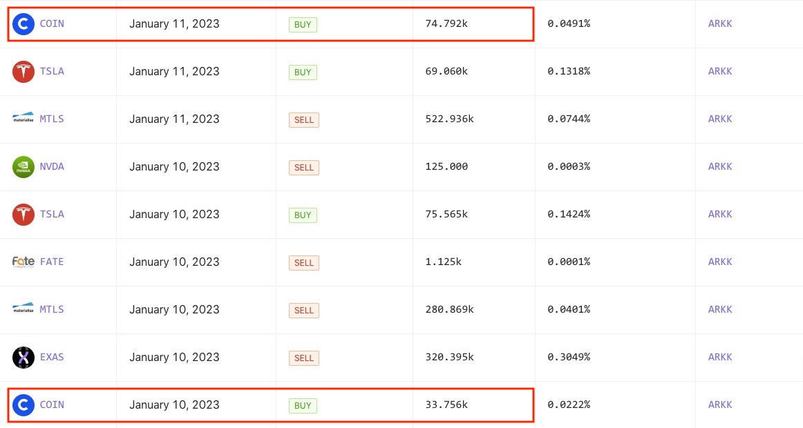 方舟基金分別在 11 日於 ARKK 買進 33,756 股 COIN,斥資 145 萬美元,12 日再於 ARK Innovation ETF (ARKK) 購入 74,792 股 COIN,價值約 328 萬美元,兩日合計花費 473 萬美元。此外 ARKK 昨日也增持 69,060 股特斯拉 (TSLA) 股票,價值約 850 萬美元。就在今日稍早,據《Coindesk》消息,隨著 COIN 繼續上漲,方舟再次買入了價值 250 萬美元的 Coinbase 股票。