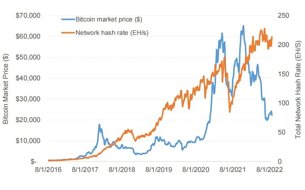 加密資產的數量、流行度以及採用何種共識機制也存在相當大的不確定性。這些因素都會影響電力需求。與 PoS 或其他能源密集型網路增長的相關風險遠低於與 PoW 網路增長帶來的風險。圖 2.2 繪製了 2016 年 8 月 1 日至 2022 年 8 月 24 日間,比特幣網路市值和網路 Hash 率的歷史趨勢。
