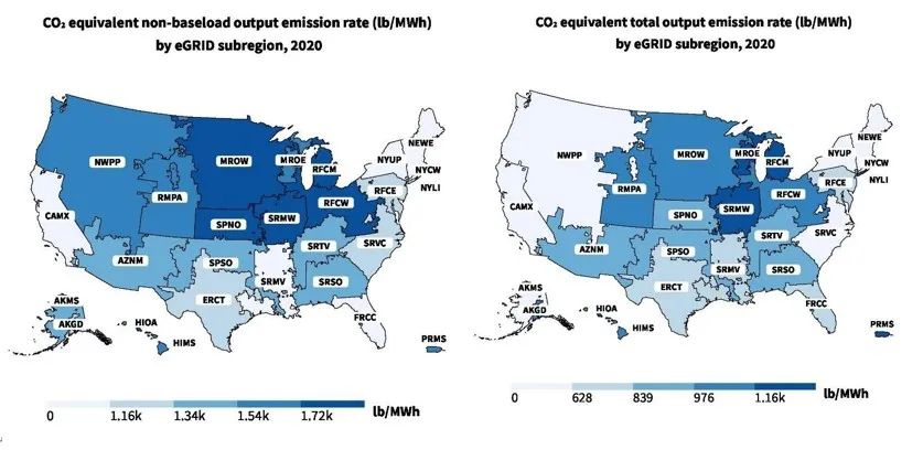 區域電力系統運營商往往分佈在多個州,它們通常會平衡電力供應和需求,並與鄰近的電網運營商進行電力交易。【138,139】由美國環保署編制的排放與發電資源綜合數據庫(eGRID) 是區域電力排放信息的權威且可獲取的來源。【140】發電產生的溫室氣體排放量因地區而異。由於煤電儲備相對較多,美國大平原的中部地區的碳強度約為700 g/kWh,其產生的每非基負荷千瓦時產生的二氧化碳當量排放量(234 g/kWh) 幾乎是加州的三倍。這些都是平均排放率,而加密資產的新電力需求在短期內(通常需要使用非基負載排放係數)及長期內(隨著電網組成的變化)都會影響電力來源。