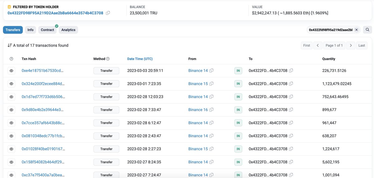 同時,鯨魚也對持倉 $TRU 和 $LQTY 展現出了極其濃厚的興趣,以太坊鏈上瀏覽器 Etherscan 數據顯示,「0x4322」開頭的地址在 2 月 23 日和 3 月 3 日以均價 0.07344 美元從幣安購入約 2350 萬枚 $TRU。