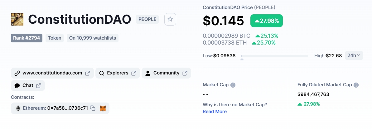 (前情提要:ConstitutionDAO終停,PEOPLE竟還瘋漲240%創新高 !WTP疑是誘因?)