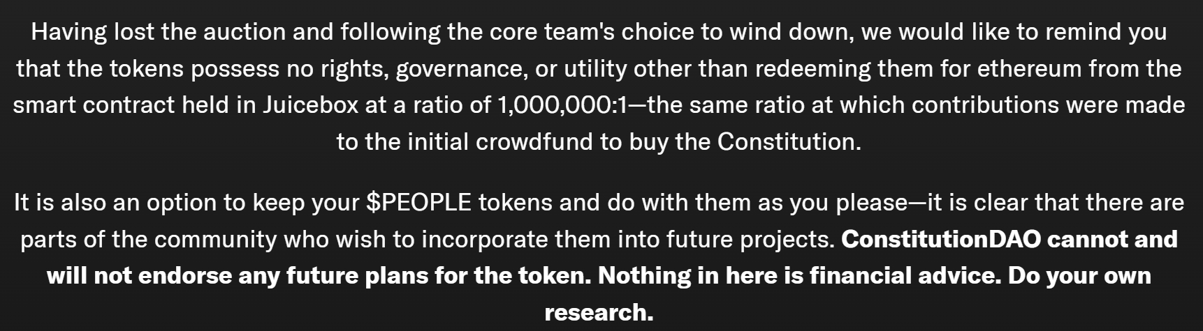 有趣的是,ConstitutionDAO 早已在官網公告中提醒, PEOPLE 已無實際作用: