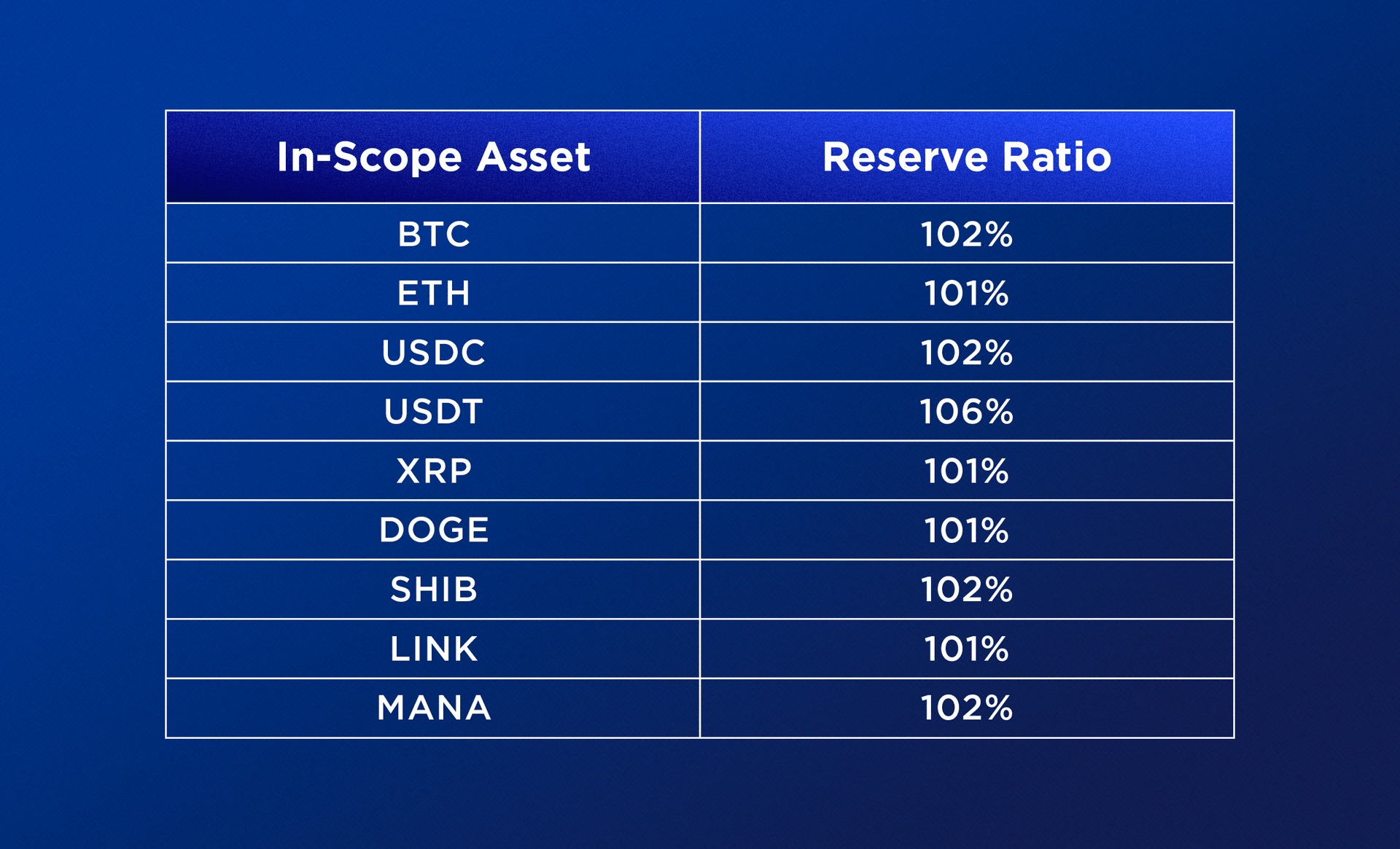 確認 BTC、ETH、USDC、USDT、XRP、DOGE、SHIB、LINK、MANA 等主要資產幣種均有超 100% 的儲備率。