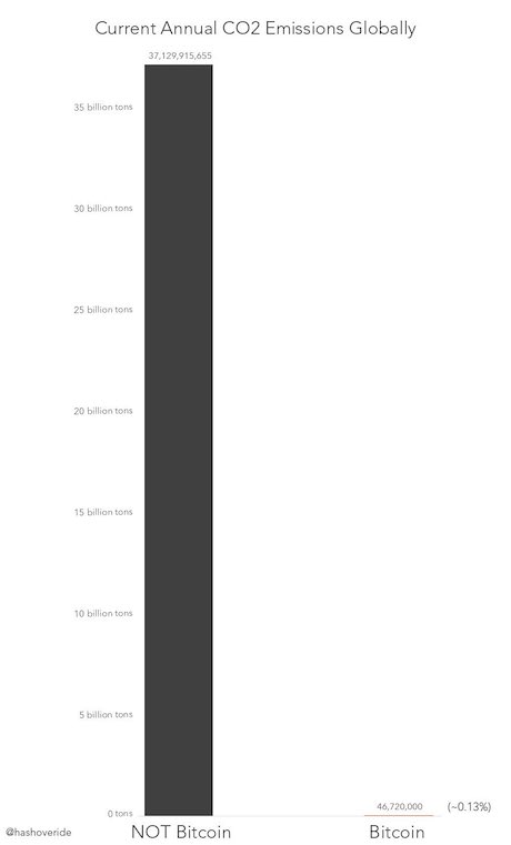 塞勒則分享了「比特幣」與「非比特幣」的全球年度二氧化碳排放量比較圖,並回應道: