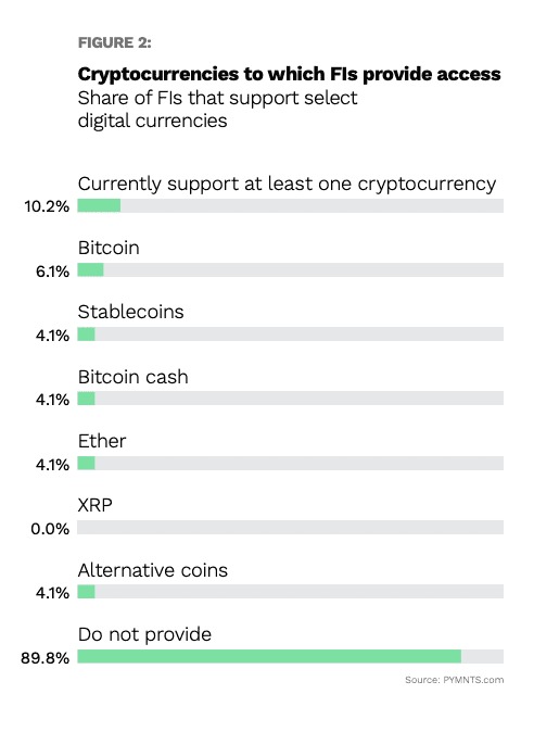 根據下面數據,6% 金融機構提供比特幣相關服務,而比特幣現金、以太坊和穩定幣各有 4% 提供。