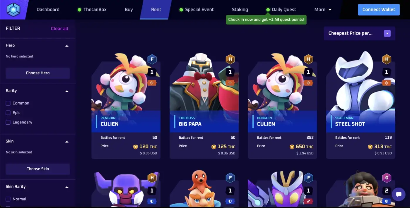 它是 BNB Chain 上最大的 MOBA(多人在線戰鬥競技場)遊戲之一,結合了免費遊戲和遊戲賺錢模式,有兩種類型的代幣——Thetan Coin(THC)和 The Gem(THG),玩家通過參與戰鬥或完成其他任務來賺取 THC 或 THG。