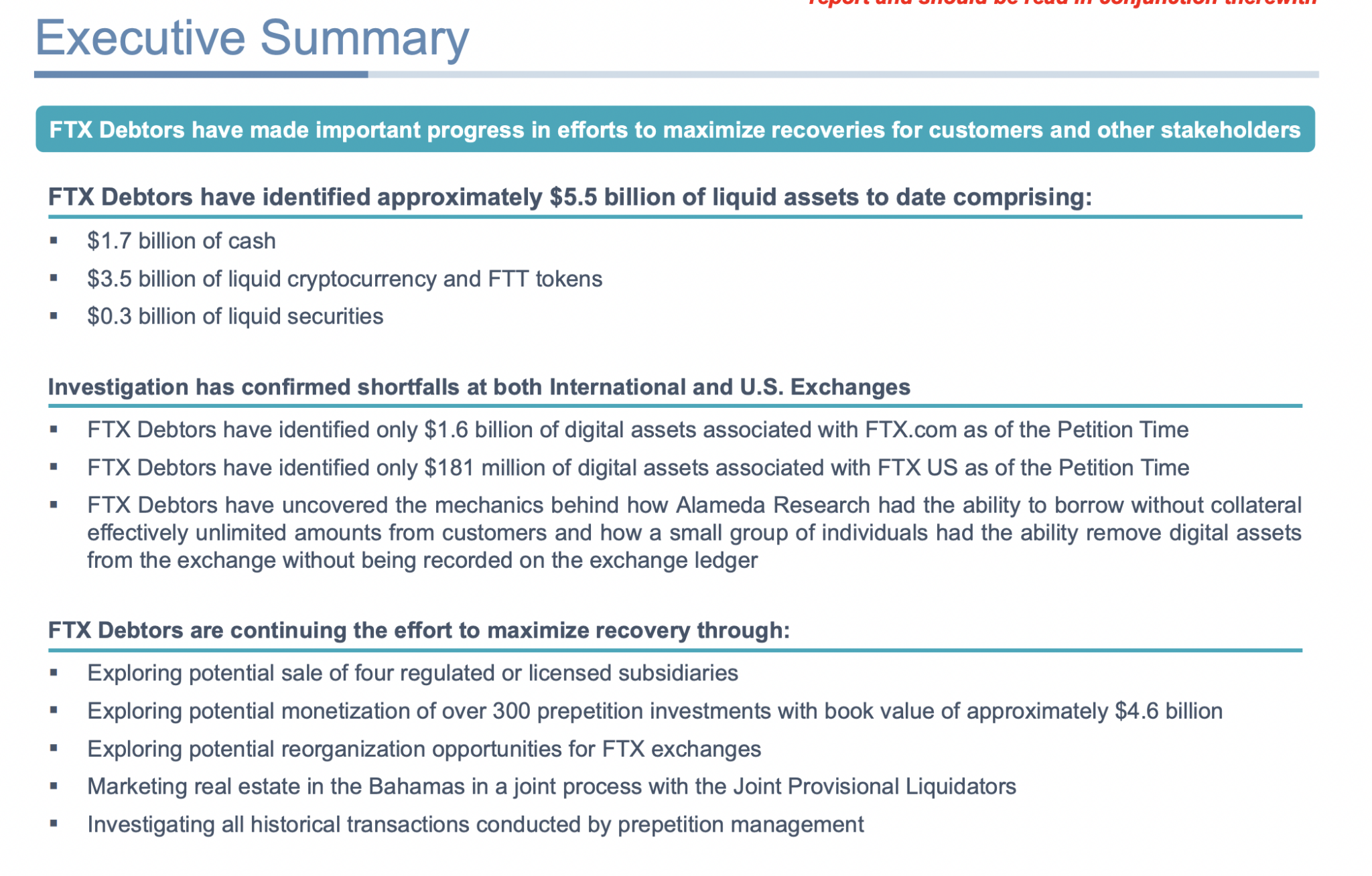 正在進行破產重組的 FTX 交易所,其現任管理層在昨(17)日與債權人招開會議,分享了迄今為止資產追回工作的最新情況。根據官方提供數據,目前已確定總計約 55 億美元的流動資產,包括 17 億美元的現金、35 億美元的加密貨幣資產和 3 億美元的證券。