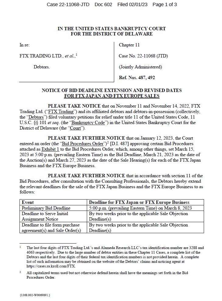 今年 1 月,美國特拉華州破產法官已裁定,FTX 可以出售旗下四個子部門,包括衍生品部門 FTX US Derivatives、 Embed 以及 FTX Japan 和 FTX Europe,而據 FTX 債權人在 2 月初分享的法庭文件,FTX 債務人已將 FTX Japan 和 FTX Europe 的拍賣截止日期延長至 4 月 26 日,LedgerX 和 Embed 拍賣日期不受影響。