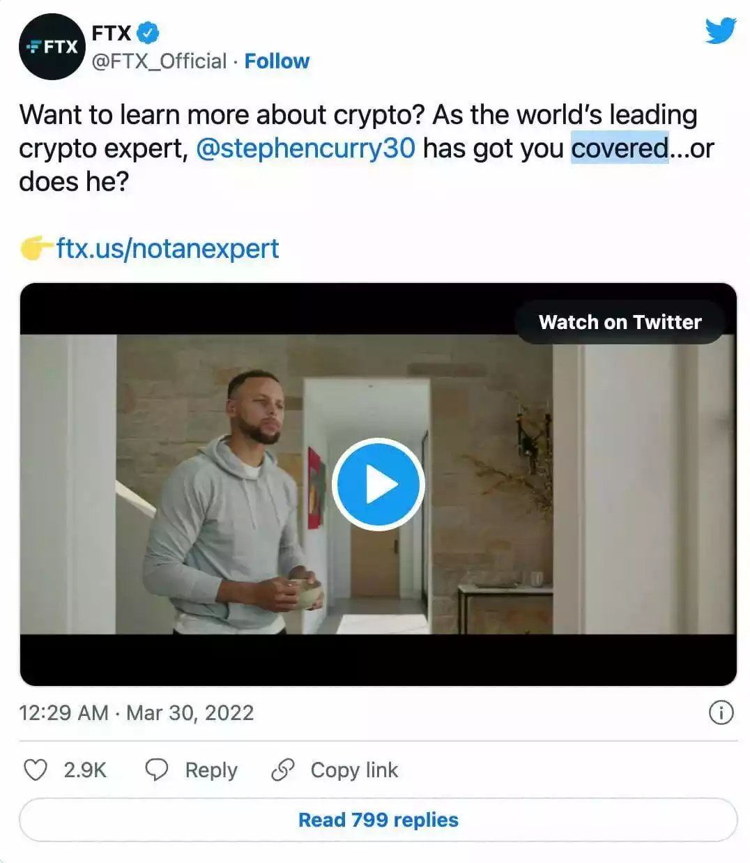 下面是一個例子說明了 FTX 如何借助美國知名籃球運動員 Stephen Curry 的影響力,用影片的方式鼓勵用戶嘗試加密貨幣交易。這條推特獲得 2900 多個贊和 799 條回覆。