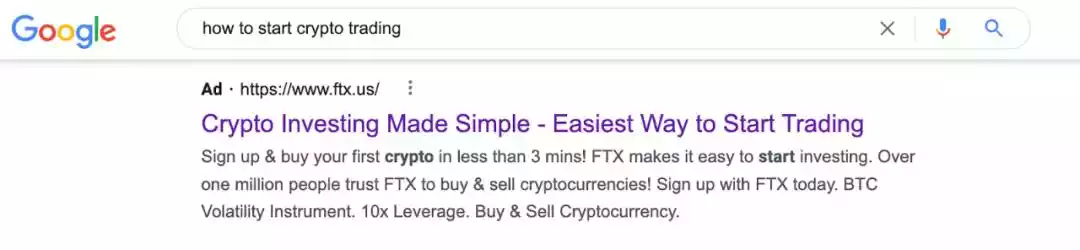 下面是 FTX 投放的 PPC 廣告的例子,強調用戶開始加密交易是多麼的容易: