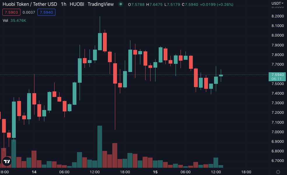 火幣平台幣 HT 昨日下午從 8.2 美元的高點,四小時內大跌 14.3% 至最低 7.02 美元,至今日截稿前報 7.59 美元 ,近 24 小時跌幅近 6%,近 7 日仍有近 80% 的漲幅,現價已距收購前的低點 4.23 美元大漲了 44%。