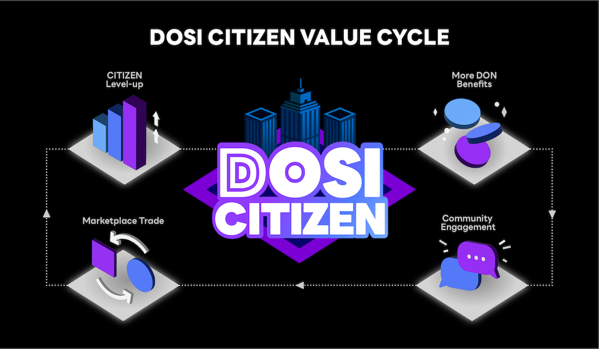 DOSI平台結合DOSI Wallet、DOSI Adventure、Citizenship等多樣化功能,打造出完整的NFT生態圈,以提供用戶最盡興順暢的體驗。在DOSI Citizen會員制項目中,用戶只要參與DOSI平台上的社群活動即可獲得「DON」會員積分點數,另外也會按照NFT購買數量發放。此積分點數可用來升級DOSI Citizen會員等級(最高至Level 4),或參與DOSI Adventure活動以贏得各式各樣的NFT獎勵。
