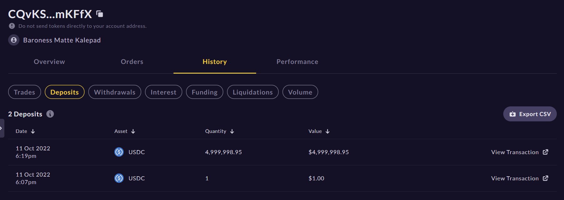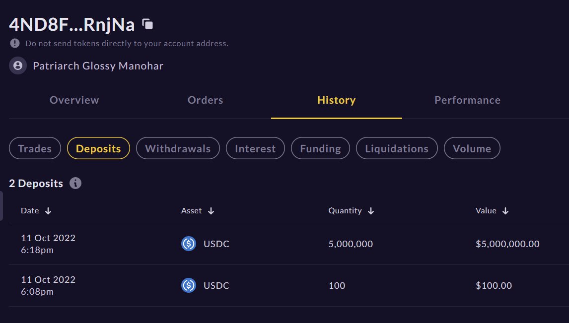 美國東部時間 11 日下午 6:19 ,攻擊者用錢包A,在Mango 存進了 500 萬美元的 USDC。