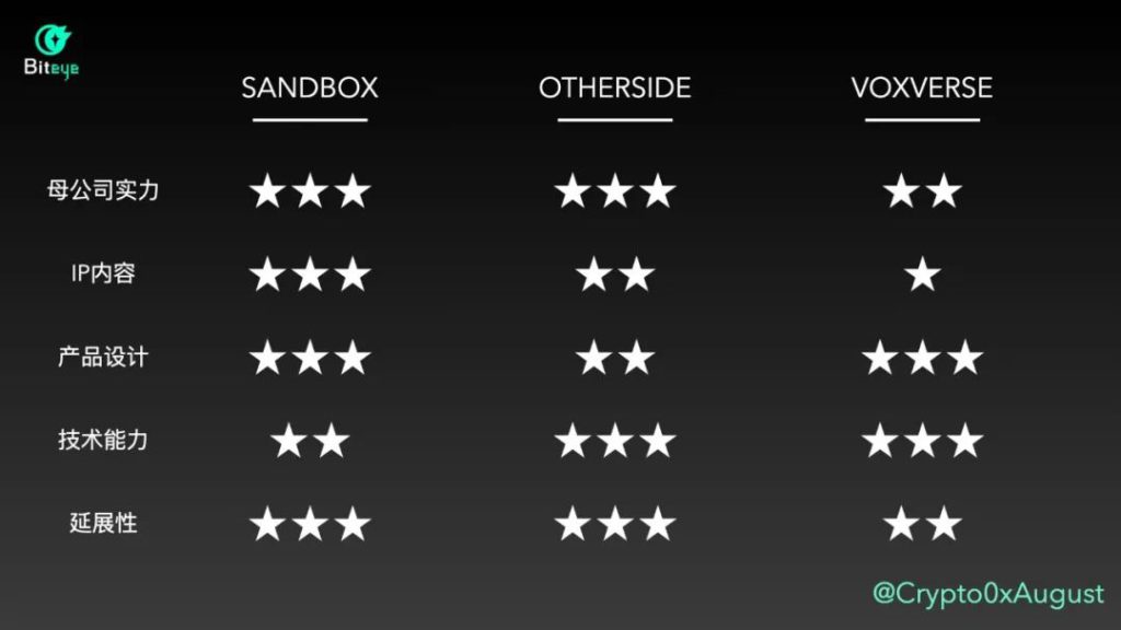 以上所列的 IP 僅限於項目本身涉及的或者宣傳片中出現的 IP,不含母公司的合作 IP。其中 OthersideMeta 和 VOXverse 幾乎都是其自有 IP,這點上 Sandbox 更甚一籌,合作遍布 Web 2 的各個領域,有奢侈品、名人、音樂、遊戲、娛樂、傳統機構等等,最大程度的遍及各方面的用戶。