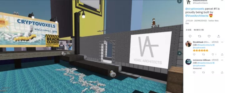 目前最著名的「施工隊」是 Voxel Architects,起源城的超大泳池、馬斯克 SpaceX 在 CryptoVoxels 中的基地等都出自他們之手。高質量的搭建也讓這些土地獲得了超高的訪問量。