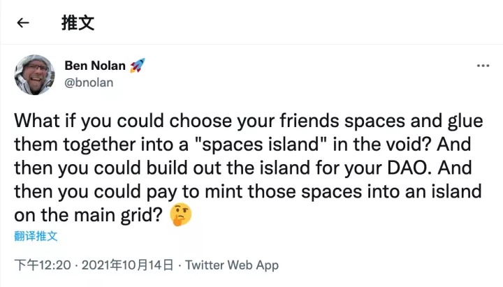 作為一款 Web 3.0 應用,CryptoVoxels 也在考慮在未來朝向更加去中心化的方向發展。 Ben Nolan 曾在個人社群媒體分享了他的想法,在未來,也許 CryptoVoxels 官方不會再發售任何土地,只會在用戶提交需求時為用戶單獨鑄造出一塊土地。