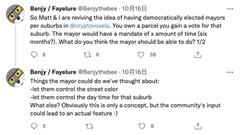 CryptoVoxels 開發者 Benjy 也提出了另一個可能性,未來也許會在 CryptoVoxels 元宇宙中引入類似「市長」的角色,每個地區的「市長」由土地擁有者們投票決定,促進這個虛擬世界更加快速、穩定、有序地發展,也會讓 CryptoVoxels 元宇宙更加豐富多彩。