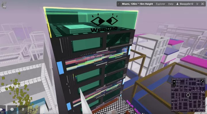 除了常規建築外,「違章建築」在 CryptoVoxels 元宇宙中大放異彩。 CryptoVoxels 中的每一塊土地都對高度、佔地面積進行了限制,不過這些限制也只能限制住人們在 CryptoVoxels 中的搭建,卻無法控制用戶上傳的模型大小,用戶可以先完成建模再將其導入 CryptoVoxels,突破了限制,用戶們就可以更加自由地揮灑創意。