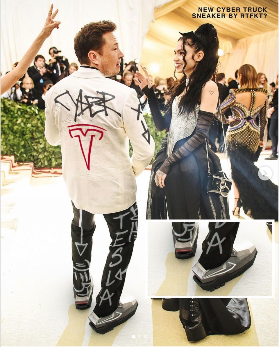 讓這間公司開始斬獲知名度的起源,是 RTFKT 所設計的一雙靈感來自特斯拉電動卡車 Cybertruck 的虛擬球鞋 Cyber Sneaker,他們將這雙球鞋編輯到馬斯克於 2018 年出席 Met Gala 慈善晚宴的照片上,並將其放在官方 Instagram 上,迅速引起粉絲的關注和詢價,當時這雙虛擬球鞋以約 15,000 美元的價格售出。