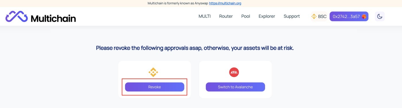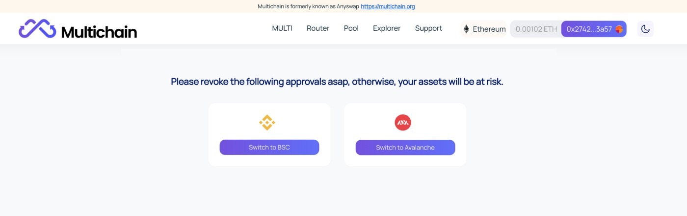 儘管 Multichain 團隊已修復該漏洞,但為避免駭客入侵的風險,強烈呼籲曾經在 Multichain 路由器上批准過任一上述代幣(WETH、PERI、OMT、WBNB、MATIC、AVAX)的用戶,盡快於平台上撤銷六種受影響代幣的錢包簽名授權。否則,用戶資產可能面臨風險。