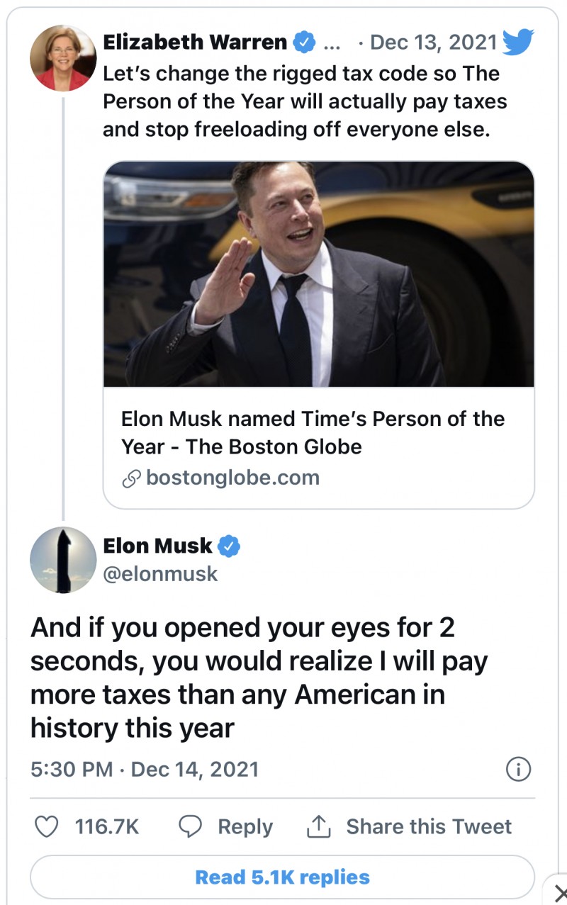馬斯克自當選 2021 年度風雲人物以來,便和反對加密貨幣的參議員伊莉莎白・華倫(Elizabeth Warren)槓上,後者控馬斯克逃稅,不只呼籲修改稅法、還買廣告募資攻擊馬斯克。此舉引動馬斯克的憤怒,表示自己今年已經繳下創美國歷史紀錄的稅金,呼籲選民應讓華倫在 2024 大選中離開參議院。