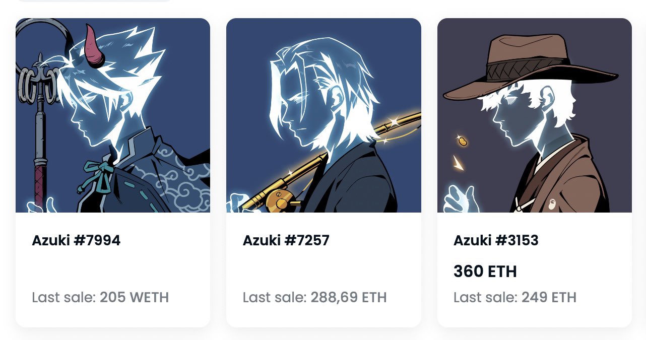 值得注意的是,近幾日 Azuki 稀有特卡不斷以高價格持續成交,Azuki #3153 先是以 249 ETH (約合 31.1 萬美元)的價格售出,而後 Azuki #7994 又以 205 ETH (約合 25 萬美元)售出,緊接著 Azuki #7257 更在昨日以高達 288 ETH 價格成交,創下該 NFT 系列迄今為止幣本位歷史第 2 高記錄。