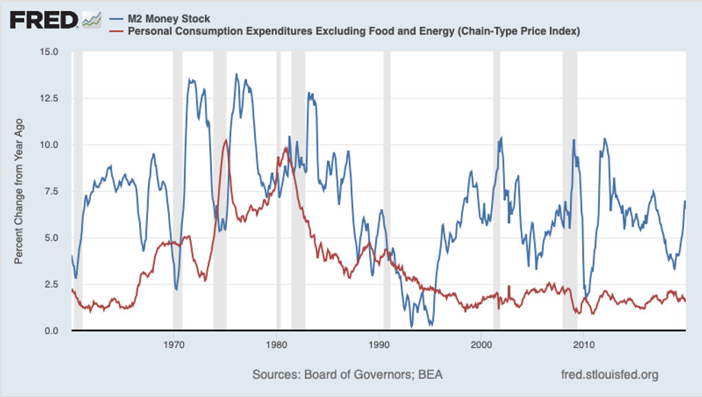 也就是說超高通膨率並未隨暴增的 M1 貨幣供給出現,反而是因為疲軟的經濟狀況和高失業率,導致整個時期的通貨膨脹率下降。