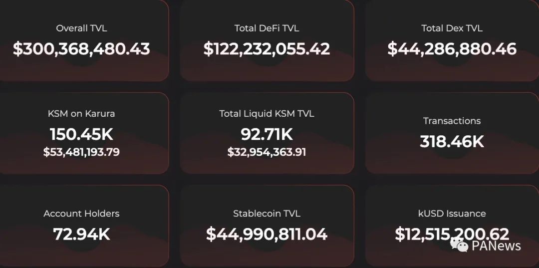 截至 10 月 18 日,Karura 全網鎖倉總價值(TVL)已超過 3 億美元。其中,DeFi 的總鎖倉價值超 1.2 億美元;DEX 在僅支持 3 種原生資產的情況下總鎖倉價值已超 4,428 萬美元;穩定幣的總鎖倉價值達 4,490 萬美元。