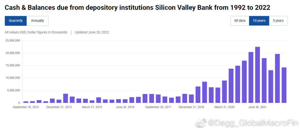 與瘋狂增持的 MBS 相比,SVB 手頭的現金和現金等價物(包括準備金,回購,短債)的增長並不明顯,2020 年中至 2021 年中只由 140 億增長到了 220 億,而到 2021 年末甚至還下降到了 130 億,甚至不及 2020 年中的水平(圖 4)。這反映出,SVB 激進配置長久期資產的同時,並沒有為應對存款流出預留出等比例的的充足的現金。