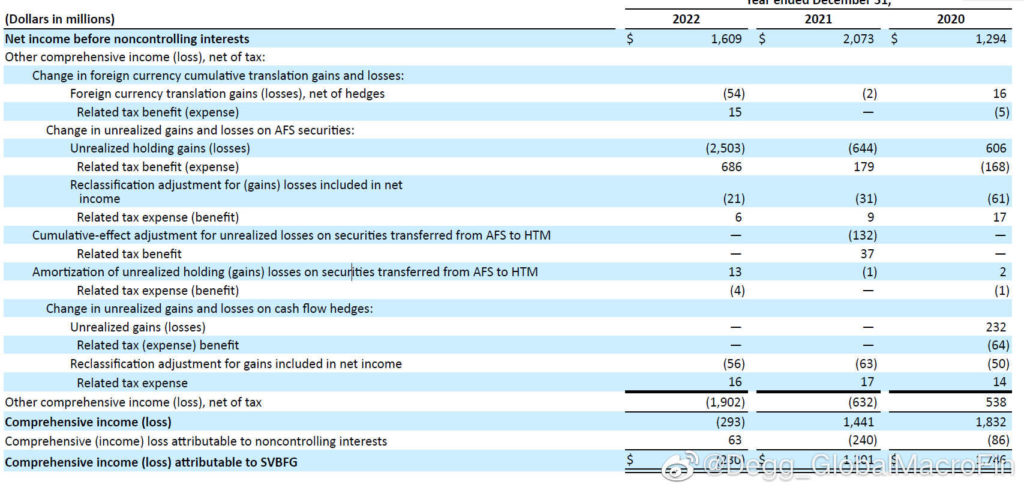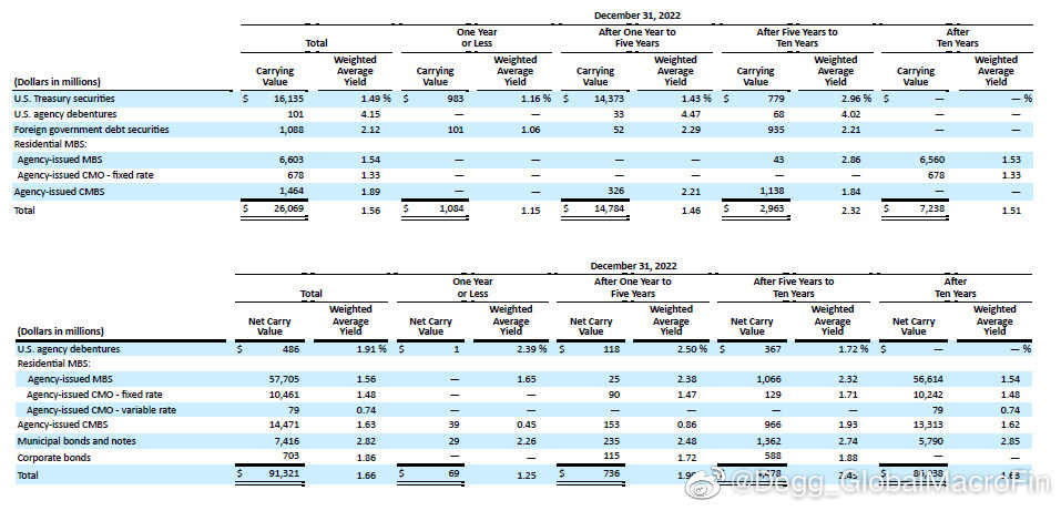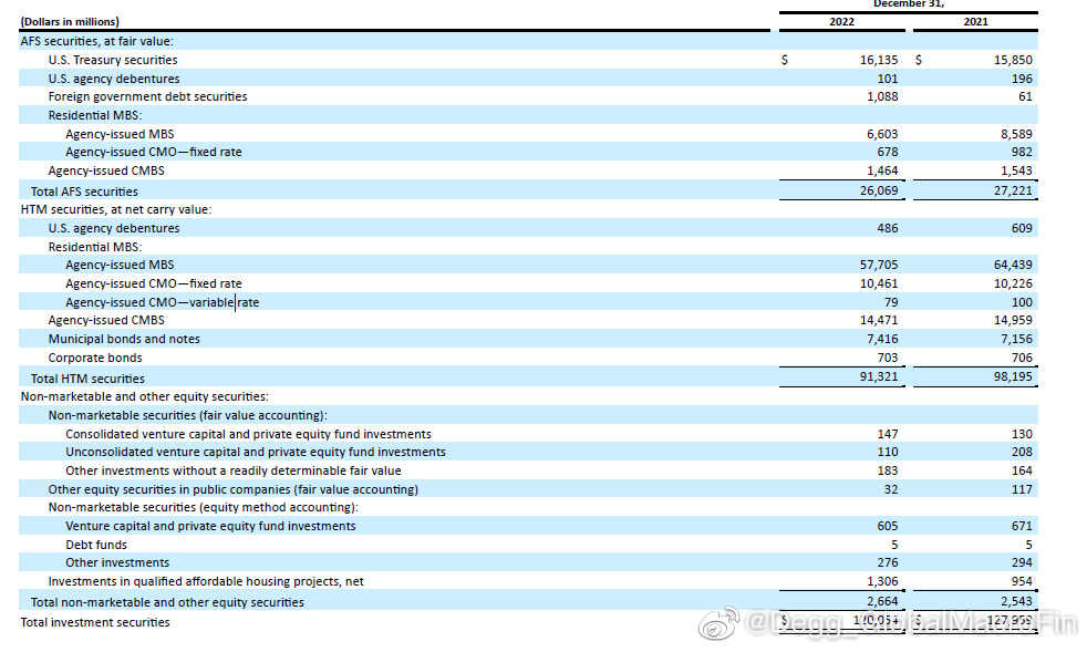 由於 SVB 的資產購買集中在 2020-2021 年低息期間,因此 AFS 和 HTM 資產的平均收益率非常低。從 10-K 看,其 AFS 的平均收益率只有 1.49%,HTM 的平均收益率只有 1.91%(圖 6)。伴隨美聯儲 2022 年的快速加息,這些低息時期購買的 AFS 資產在 2022 年給 SVB 帶來了超過 25 億美元的未實現損失(unrealized loss,圖 7),而如果將 1000 億以 HTM 計量的 MBS 的未實現損失考慮進去,總的未實現損失高達 175 億美元(HTM unrealized loss 大約 150 億美元,圖 8)。