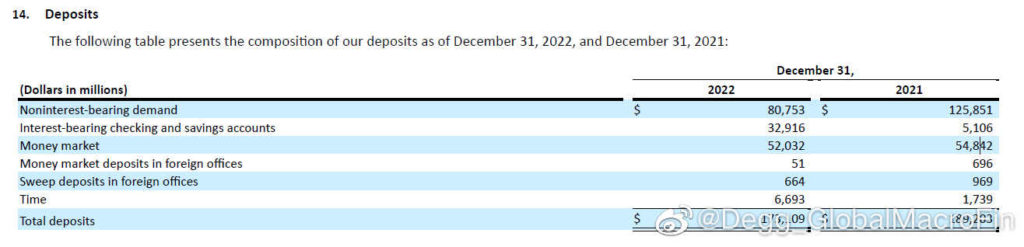 這些未實現損失只要你不賣,就不會成為損失,因此往往被視作「浮虧不是虧」。問題是,2022 年美聯儲快速加息導致全球科技初創企業的日子都不好過,融資融不到,股價一直跌,但研發還得繼續,就只能持續消耗它們在 SVB 的存款。再疊加美聯儲縮表等因素,SVB 的存款自 2022 年 3 月觸頂後就一直流出。2022 年全年存款總額下降了 160 億,大約占存款總額的 10%,特別是活期無息存款由 1260 億驟降至 810 億,大大增加了負債端的利息支出壓力(圖 9)。